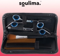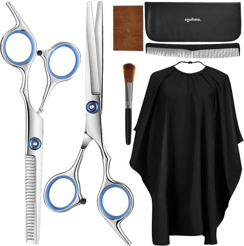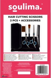 Kompletná kadernícka sada na domáce aj profesionálne použitie s 2 pármi nožníc (klasické a efilačné/degažovacie), ochrannou pláštenkou, hrebeňom, štetcom a puzdrom na zips. Kvalitné nerezové nožnice s ergonomickými opierkami prstov a modrými vložkami zaistia precízny strih a pohodlie. Všetko prehľadne uložené pre bezpečné skladovanie a cestovanie.