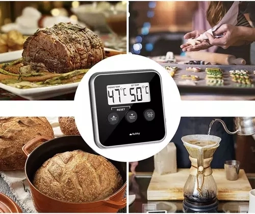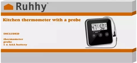 Praktický digitálny kuchynský teplomer so sondou RUHHY na presné varenie, pečenie aj grilovanie. Ponúka široký rozsah −20 až 250 °C, prehľadný LCD displej, alarm s minútkou, magnetické uchytenie a nerezovú sondu s odolným káblom.