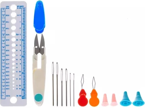 Sada zahŕňa nielen háčiky, ale aj nožnice, pravítko a ďalšie nástroje nevyhnutné pre háčkovanie.