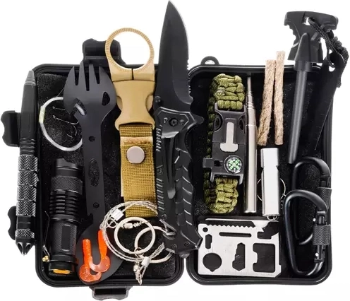 Kompletná survivalová sada na turistiku, kempovanie aj núdzové situácie v kompaktnom, vodotesnom puzdre. Obsahuje 32 praktických nástrojov vrátane noža, svietidla, kresadla, paracord náramku s kompasom, karty prežitia 11 v 1 a termofólie. Ľahká a ľahko prenosná výbava, ktorá pomáha zaistiť teplo, svetlo, oheň a základný komfort v teréne.