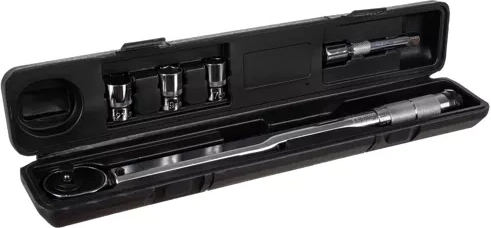 Robustný momentový kľúč 1/2" s račňou a sadou nástavcov 17/19/21 mm a predĺžením na presné uťahovanie aj povoľovanie skrutkových spojov. Ponúka rozsah momentu 28–210 Nm, obojsmerný chod pravý/ľavý, uzamykanie LOCK/UNLOCK a praktické ochranné puzdro na bezpečné uloženie. Ideálny pre šesťhranné aj štvorhranné skrutky, háčiky a motocyklové matice.