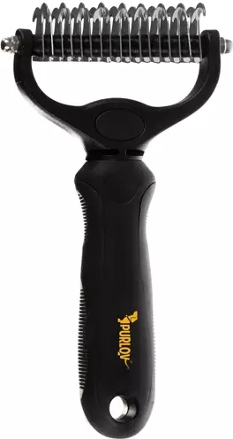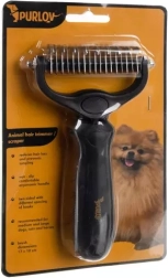 Univerzálny obojstranný trimer a hrablo na srsť PURLOV pre psy a mačky kombinuje stranu so 17 jemnejšími zubami a stranu s 9 širšími zubami pre hustú podsadu aj jemnú srsť. Efektívne znižuje línanie, ľahko rozčesáva chuchvalce a podsadu a vďaka ergonomickej, protišmykovej rukoväti sa pohodlne používa. Zaoblené konce zubov sú šetrné k pokožke.