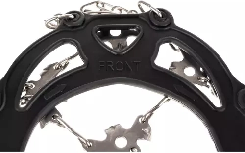 Osem oceľových hrotov a reťazky na každej topánke poskytujú spoľahlivý záber pri chôdzi po zľadovatenom či zasneženom povrchu.