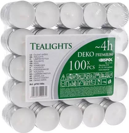 Čajové sviečky s neutrálnym plameňom a približne 4-hodinovou výdržou sú univerzálnym doplnkom pre každé prostredie. Hodí sa do aroma lámp a dekoratívnych svietnikov aj na ohrev pokrmov v chafing nádobách. Kovový kalíšok zabezpečuje bezpečné použitie bez nechceného rozliatia vosku.