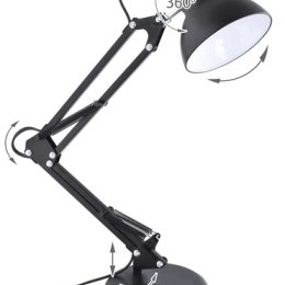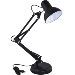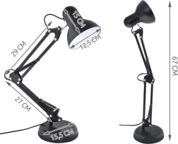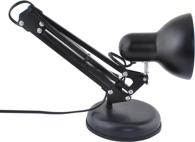 Táto elegantná čierna stolová lampa je perfektným doplnkom pre váš pracovný priestor vďaka svojmu retro dizajnu. S kovovou konštrukciou poskytuje pevnosť a výdrž, zatiaľ čo jej ťažká základňa zabraňuje prevráteniu. Je vybavená nastaviteľným ramenom so zabudovanými pružinami, čo umožňuje ľahké prispôsobenie výšky a smeru svetla presne podľa vašich potrieb.