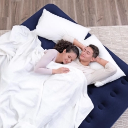 Odolný vinylový (PVC) materiál znesie časté používanie, zatiaľ čo praktické ventily na rýchle nafukovanie a vyfukovanie s blokáciou šetria čas pri stavaní aj balení. Rozmer 203 × 183 × 22 cm pohodlne pojme dve osoby, takže je ideálny do obývačky aj do stanu.