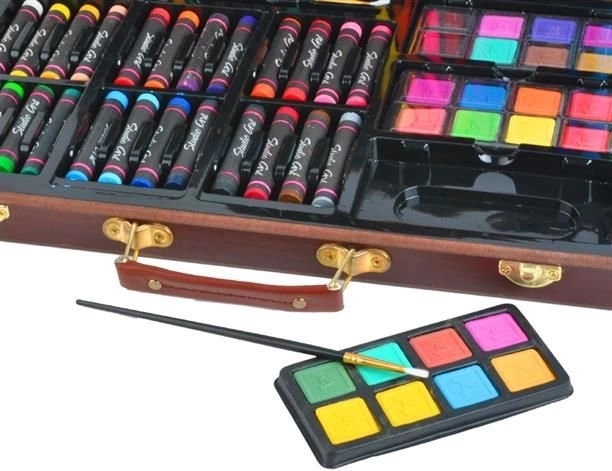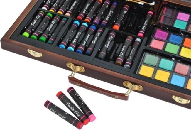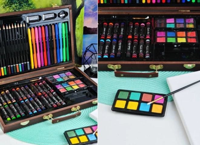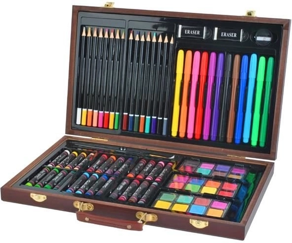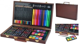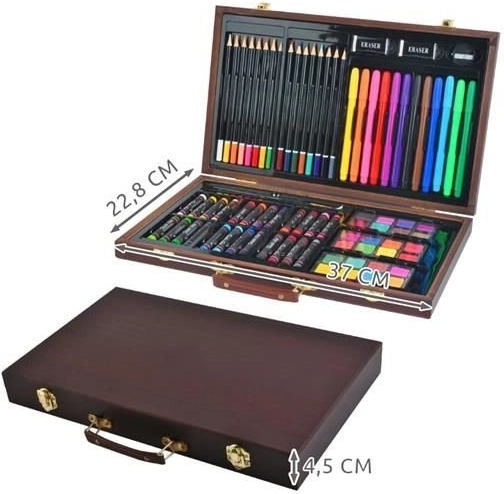 Táto univerzálna výtvarná sada prináša všetko, čo potrebujete na rozvoj kreativity – od skicovania až po akvarelovú maľbu. Všetko je uložené v odolnom drevenom kufríku s bezpečnými kovovými prackami a pohodlnou koženou rukoväťou na jednoduché prenášanie. Vďaka samostatným priehradkám máte každú pomôcku okamžite po ruke a v dokonalom poriadku.