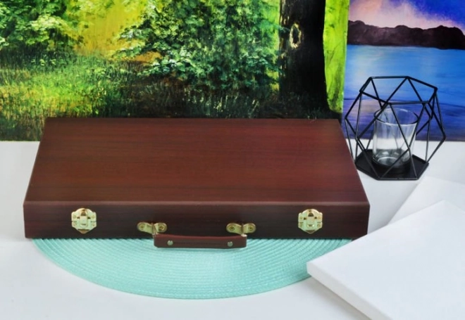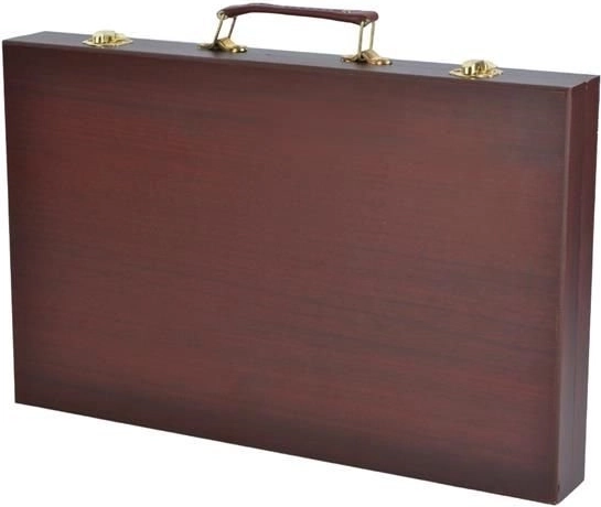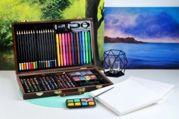Všetky výtvarné potreby sú uhladne usporiadané v rozkladacom drevenom kufríku s priehradkami, takže máte vždy rýchly a jednoduchý prístup ku všetkému, čo potrebujete.