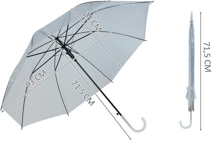 Priehľadný plášť z PVC umožňuje bezpečne sledovať cestu aj pri silnejšom daždi, keď je potrebné držať dáždnik pod uhlom. Dáždnik je zároveň štýlovým doplnkom k elegantným outfitom, vrátane svadobných či spoločenských šiat.