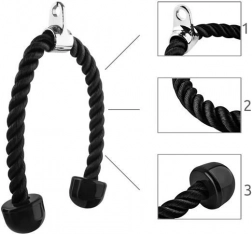 Naše tricepsové lano je ideálne pre širokú škálu cvikov zameraných na ramená, hrudník, chrbát, tricepsy a brušné svaly. Vďaka husto pleteným vláknam z nylonu má maximálnu nosnosť až 200 kg, čo zaisťuje jeho odolnosť a dlhú životnosť.