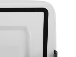 Chladnička podporuje dvojité napájanie – zo siete 220–240 V aj zo zásuvky v aute 12 V (oba káble v balení). Nízka hlučnosť zaisťuje komfortnú prevádzku, zatiaľ čo jazýčková rukoväť bezpečne uzamkne dvierka proti samovoľnému otvoreniu počas prepravy. Prepínanie režimov prebieha zadným prepínačom s kontrolkou.