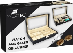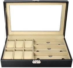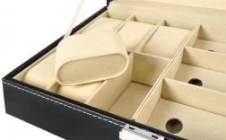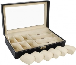 Elegantný čierny organizér s bielym prešívaním kombinuje reprezentatívny vzhľad a praktickosť. Presklené veko umožňuje prehľadnú prezentáciu obsahu, zatiaľ čo oddelené priehradky s mäkkou výstelkou chránia hodinky, okuliare aj ďalšie šperky pred poškrabaním a nechceným kontaktom.