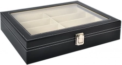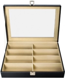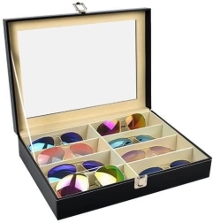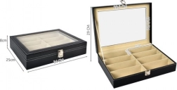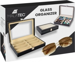 Tento kvalitný box na okuliare od značky SOULIMA spája elegantný dizajn s praktickým usporiadaním. Čierna ekokoža s bielym prešívaním pôsobí reprezentatívne, zatiaľ čo svetlá vnútorná vložka prehľadne ukáže každý pár. Sklenené veko slúži na rýchly náhľad aj na dekoratívnu expozíciu.