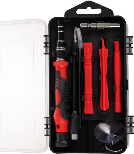 Magnetizér/demagnetizér, pinzeta s jemnou špičkou a prísavka na sklo uľahčia bezpečné rozoberanie citlivých zariadení bez poškodenia.