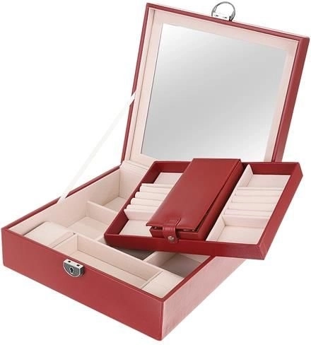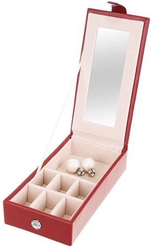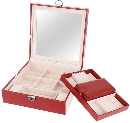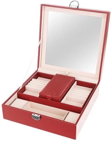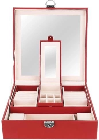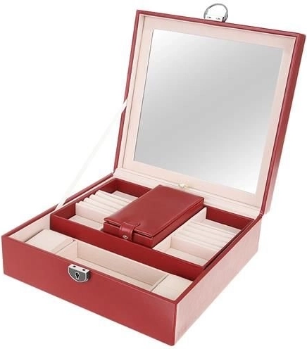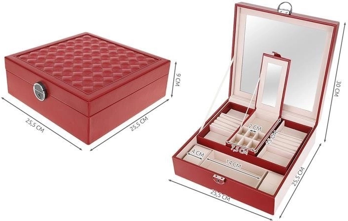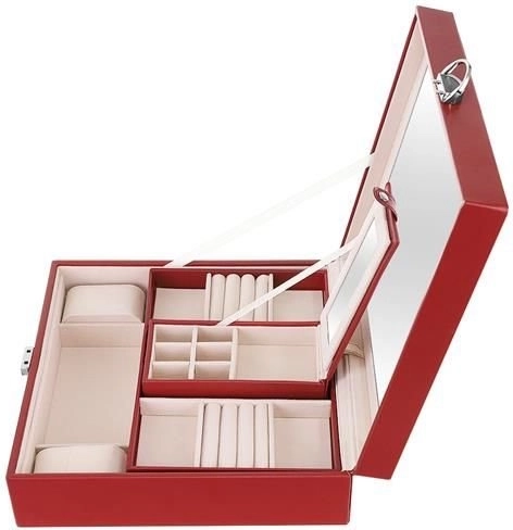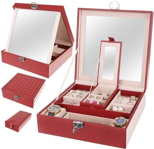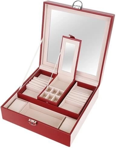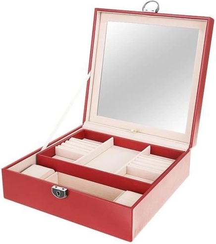Klenotnica obsahuje niekoľko poschodí a priehradiek na prstene, hodinky, náhrdelníky a ďalšie cennosti. Mäkká výstelka chráni krehkú bižutériu pred poškodením.