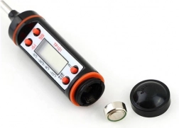 Praktický digitálny kuchynský teplomer s LCD displejom a nerezovou sondou na rýchle a presné meranie teploty mäsa, tekutín, olejov aj vína. Ponúka rozsah -50 až +300 °C, presnosť 1 °C, funkciu HOLD, pamäť posledného merania a automatické vypnutie. Ľahko čitateľné zobrazenie °C/°F, napájanie batériou LR44 (súčasť balenia).