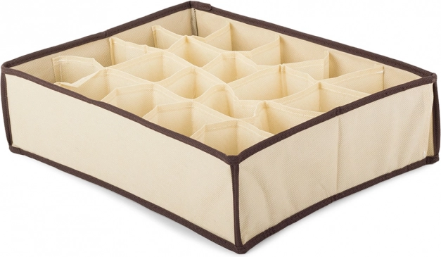 Praktický béžový organizér pre prehľadné uloženie spodnej bielizne a ponožiek vo vašej skrini alebo zásuvkách. Disponuje 16 priehradkami, ktoré vám pomôžu udržať poriadok v každej zásuvke.