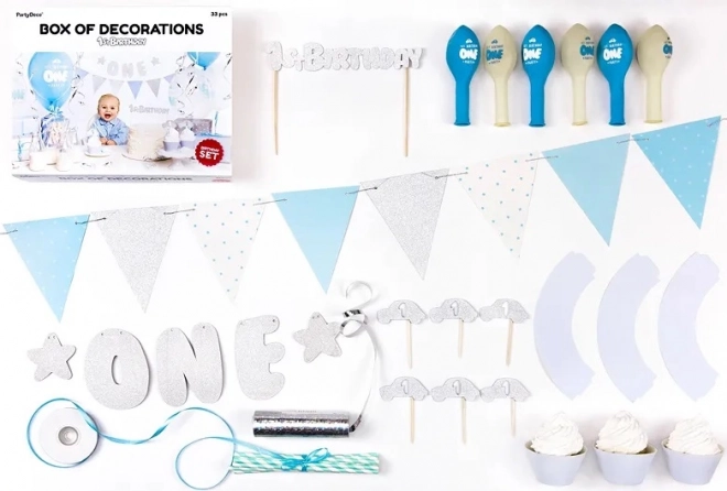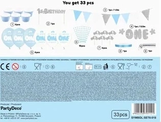 - Banner "One" (1 ks), papierová girlanda (1 ks), dekorácie na muffiny (6 ks), modré košíčky na muffiny (6 ks), topper na tortu (1 ks), slamky (10 ks), balóniky – mix vzorov (6 ks), strieborné serpentíny (1 ks), svetlomodrá saténová stuha (šírka 6 mm, 1 ks)