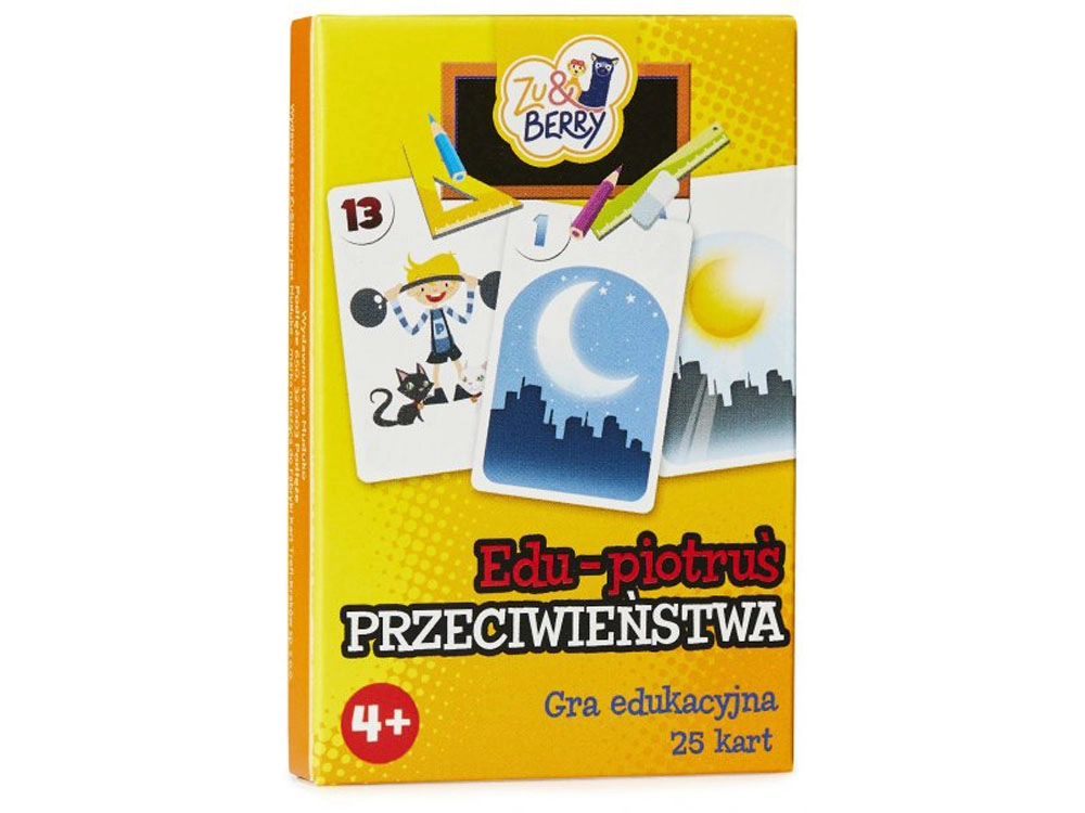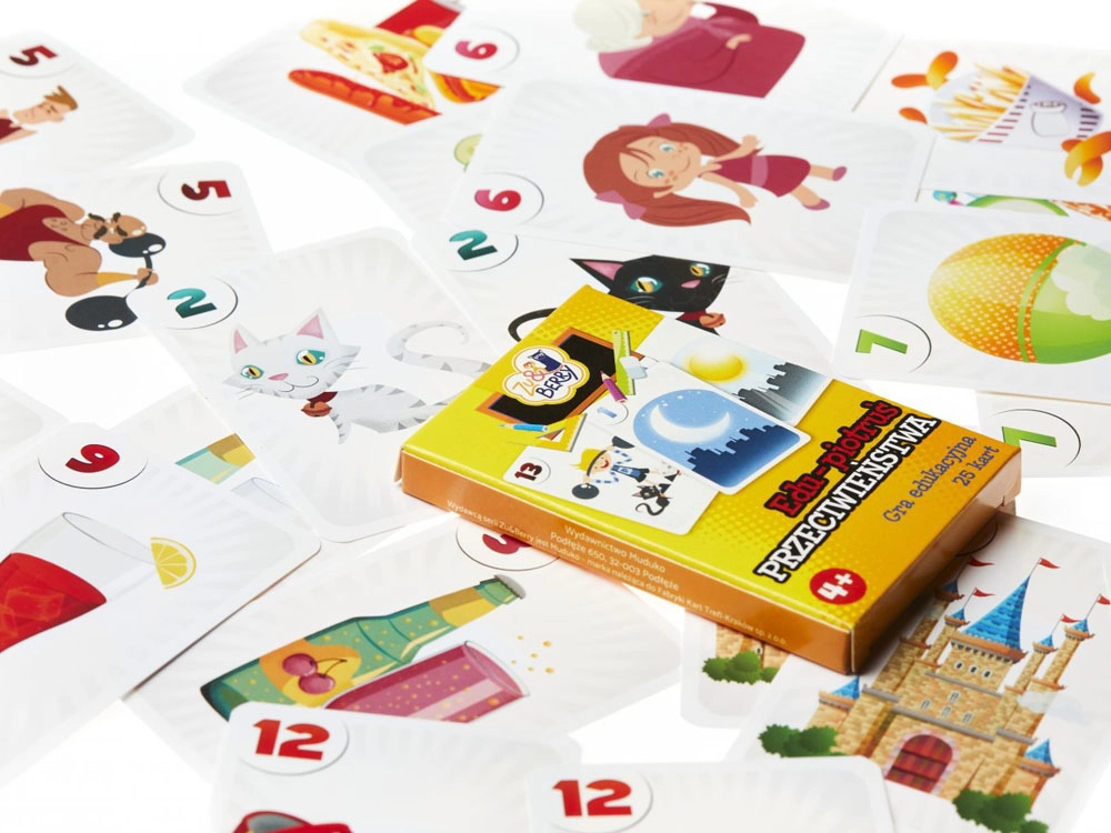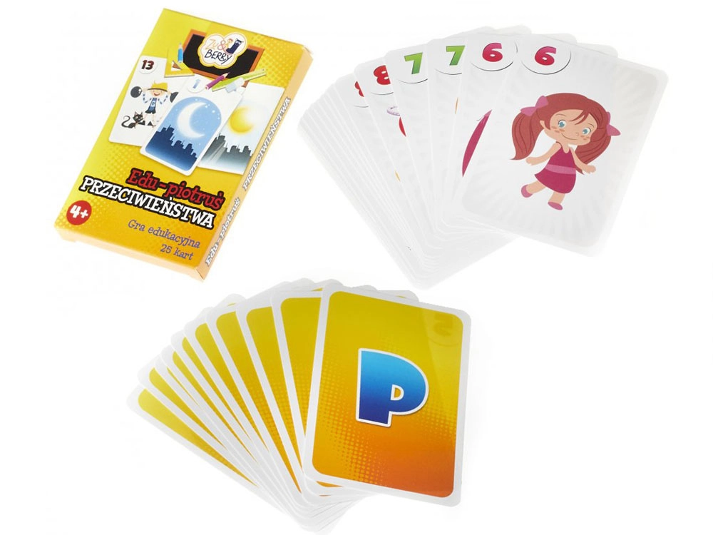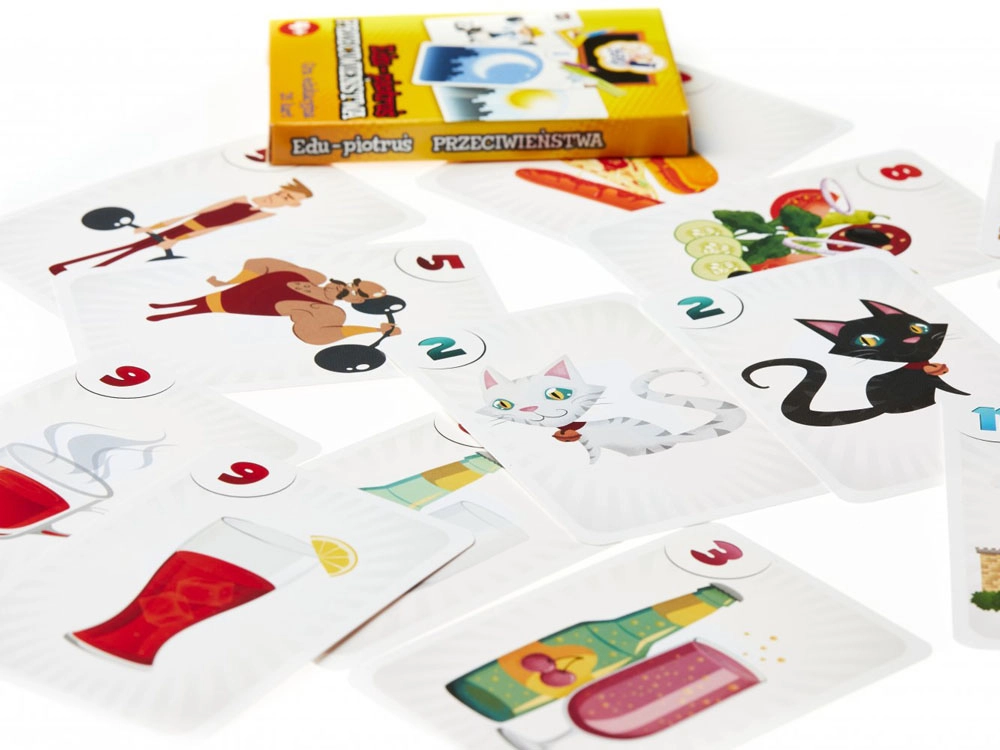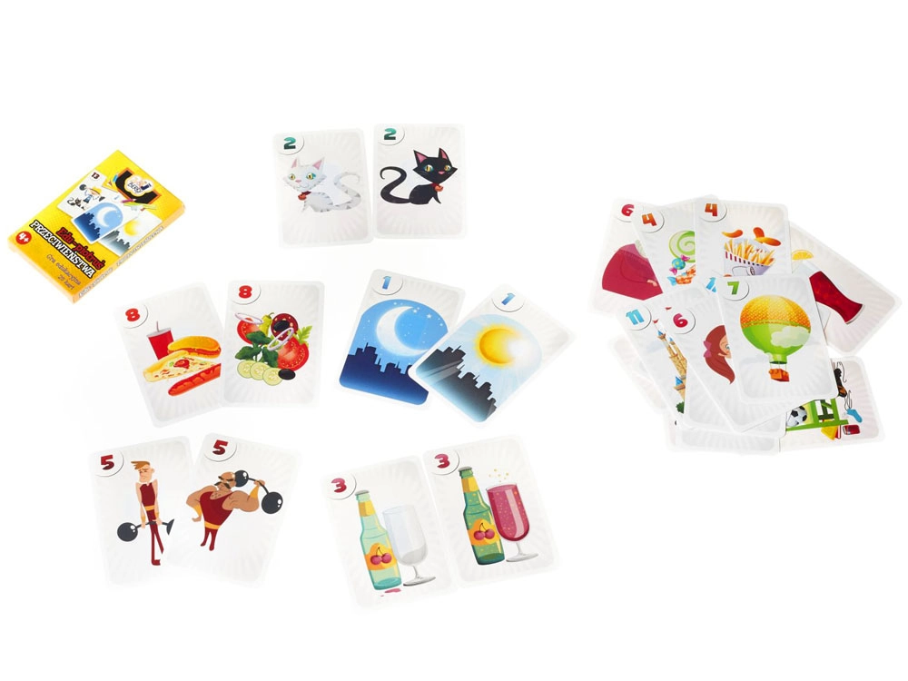 Sada obsahuje 25 kariet s farebnými ilustráciami: 12 párov zobrazujúcich obrázky s protikladnými významami a 1 kartu „čierneho Petra“.