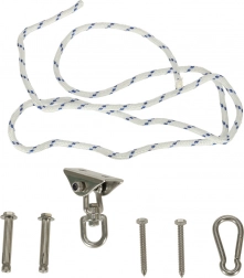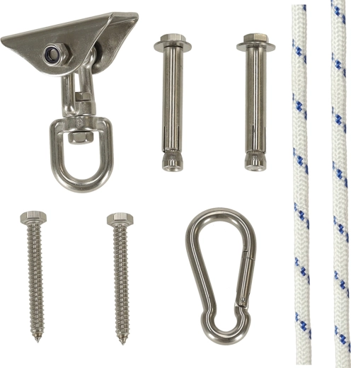 - Kompletná sada: otočný hák, karabína, lano, 2 skrutky do dreva a 2 rozpínacie skrutky do betónu.