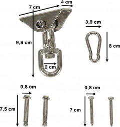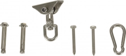 Univerzálny stropný držiak na bezpečné zavesenie hamaky, hojdačky či boxovacieho vreca. Obsahuje všetko potrebné: otočný hák 360°, karabínu, lano a skrutky do dreva aj betónu. Nehrdzavejúca oceľ 304 zabezpečuje odolnosť voči hrdzi a nosnosť až 300 kg.