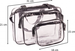 Praktická sada 3 priehľadných kozmetických tašiek z odolného vodoodolného PVC vám uľahčí cestovanie aj každodennú organizáciu. Rôzne veľkosti, zipsové zapínanie a jednoduché čistenie zaistia poriadok v kufri, batohu aj kúpeľni. Transparentný materiál urýchli kontrolu na letisku a pomôže rýchlo nájsť, čo potrebujete.