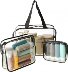 Sada zahŕňa malú, strednú a veľkú tašku – od drobných fľaštičiek a liekov až po kozmetiku či plavky. Najväčšia taška má praktické ušká pre pohodlné prenášanie. Po návrate ich môžete vložiť do seba a ušetriť miesto pri skladovaní.