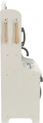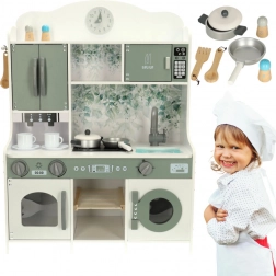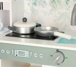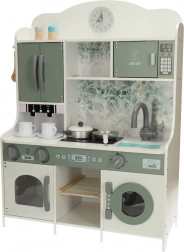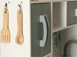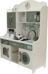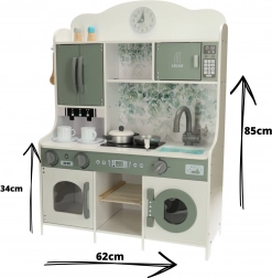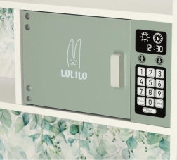 Kuchynka obsahuje mikrovlnnú rúru, práčku, rúru na pečenie, a kávovar, čo umožňuje deťom skúmať a napodobňovať skutočné kuchynské úkony.