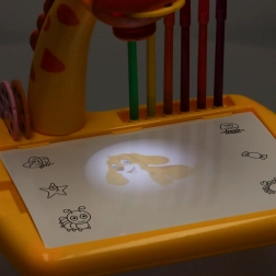 Tento roztomilý stolový projektor v tvare žirafy spestrí každé tvorenie. Po vložení jedného z troch kotúčov s obrázkami a zapnutí projekcie sa na plochu premietne motív, ktorý deti ľahko obkreslia. Vďaka stieracej podložke môžu skúšať znova a znova – bez plytvania papierom.