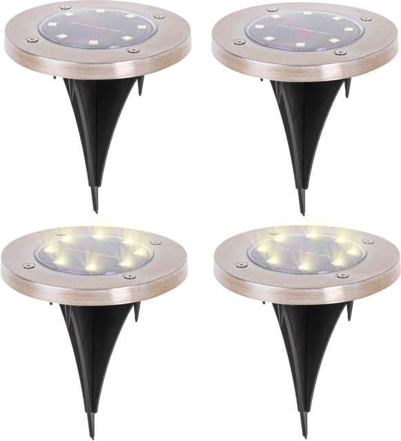 Vneste do záhrady, na terasu aj popri chodníkoch elegantné a odolné solárne osvetlenie. Tento set 4 zapustených svietidiel s 8 LED v každej lampe ponúka teplé biele svetlo, automatické rozsvietenie pri súmraku, bezdrôtovú prevádzku a úsporu energie vďaka napájaniu slnkom. Odolné materiály so stupňom krytia IP44 zaisťujú spoľahlivú prevádzku po celý rok.