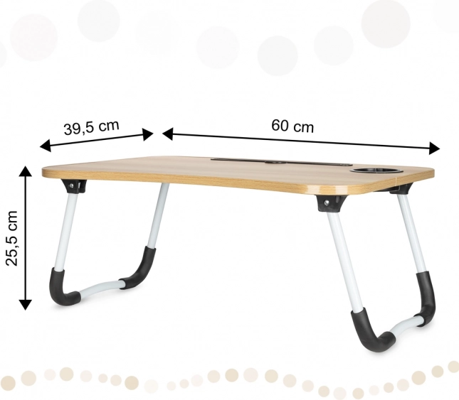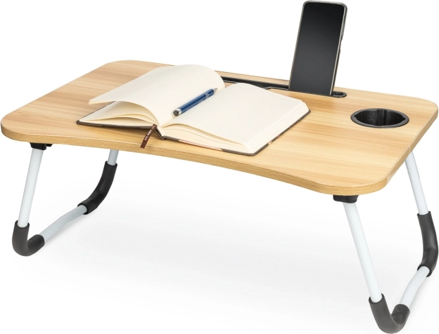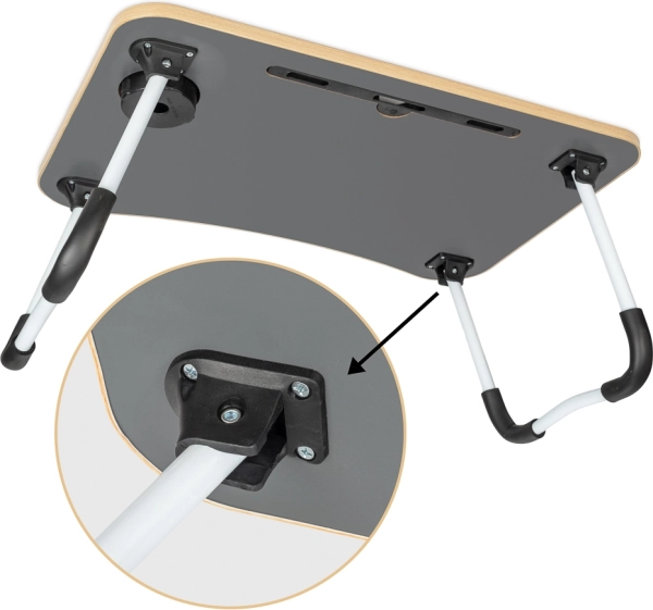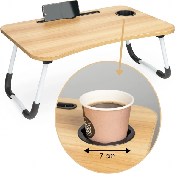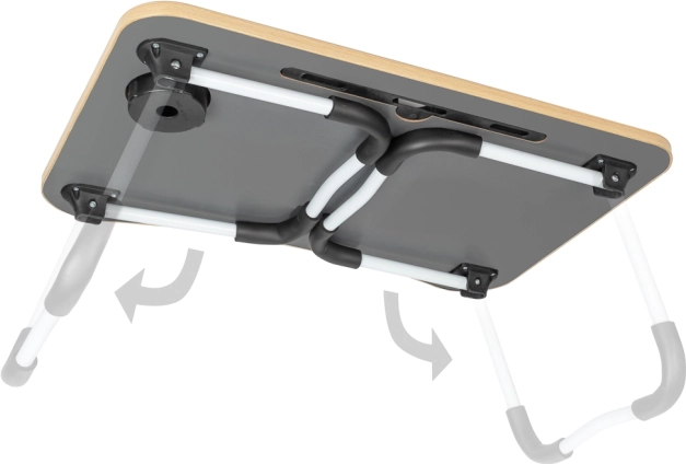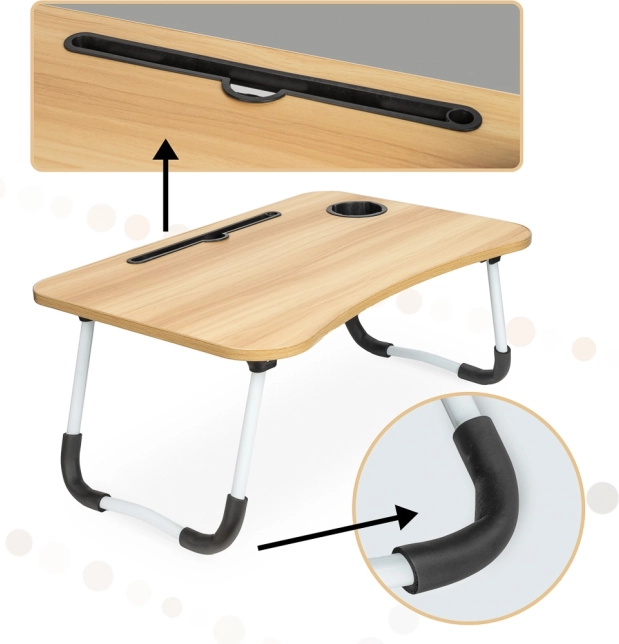 Stôl je vybavený slotom pre tablet či telefón a otvorom pre káble, čo zvyšuje jeho praktickosť. Ak hľadáte dokonalého pomocníka pre pohodlnú prácu z akéhokoľvek miesta, je tento skladací stôl na notebook tou správnou voľbou.