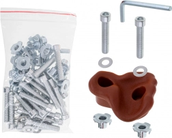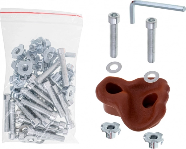 Montáž je jednoduchá a rýchla – v balení je kompletná sada montážneho príslušenstva. Chyty majú hrubý povrch pre pevný úchop a zaoblené hrany pre vyššiu bezpečnosť. Ideálne pre domáce lezecké steny, záhradné preliezačky aj detské izby.