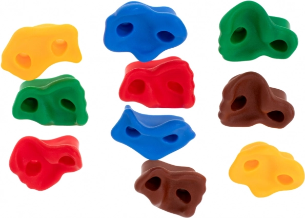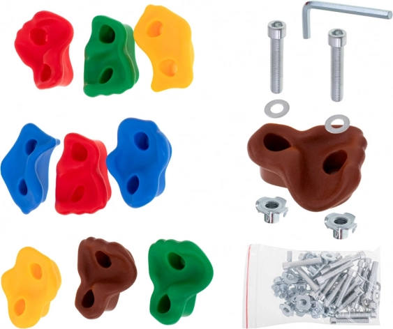 Farebné lezecké chyty pre deti premenia každú stenu na zábavnú prekážkovú dráhu. V balení nájdete všetko na rýchlu montáž – 10 odolných chytov, skrutky, podložky a matice aj imbusový kľúč. Chyty majú protišmykovú, hrubú štruktúru a rôzne tvary pre bezpečný a istý úchop.