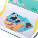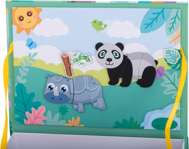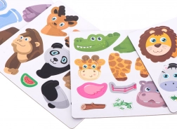 Jednoduchými krokmi môžete knihu otvoriť a začať tvoriť scény so safari zvieratami, ako sú lev, slon, zebra a ďalšie. Keď si dieťa nie je isté s tvarom zvieraťa, môže využiť farebné karty s predpripravenými vzormi.