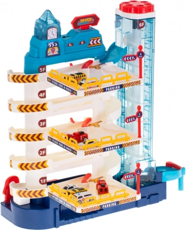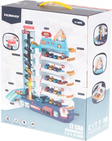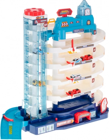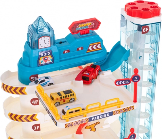 Tento realistický parkovací dom premení detskú izbu na rušné mesto. Vďaka automatickému výťahu vyveziete autíčka až na vrchné poschodia, po špirálových rampách potom svištia dole. Blikajúce svetielka a veselá melódia z veže s hodinami dodajú hre atmosféru – zvuk možno samostatne zapínať a vypínať.
