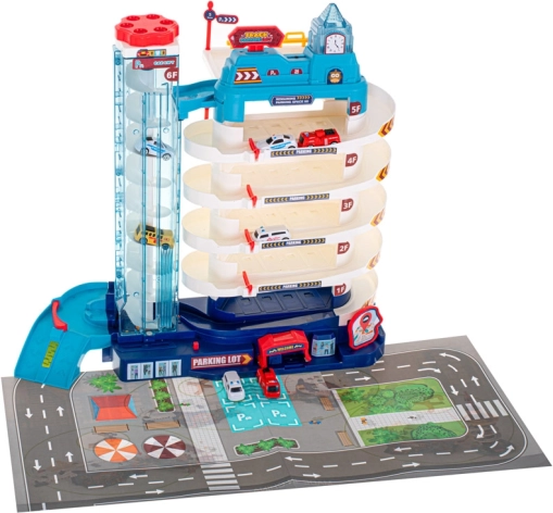 Veľké viacposchodové parkovisko pre deti ponúkne až 5 úrovní parkovania, elektrický aj manuálny výťah, svetelné a zvukové efekty a navyše 8 kovových/plastových autíčok a hernú podložku s mestom. Skvelá hračka na rozvoj fantázie, jemnej motoriky a logického myslenia.