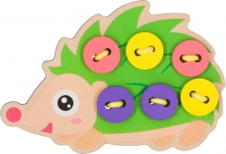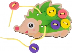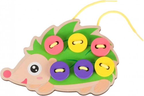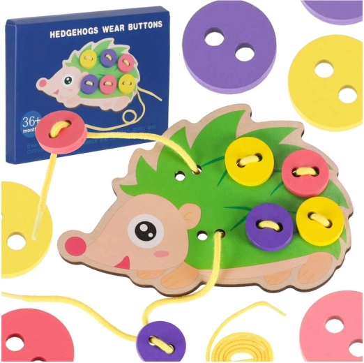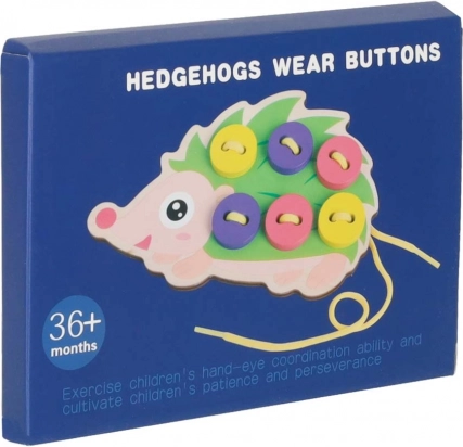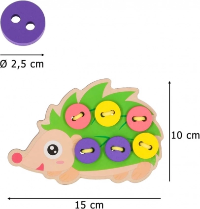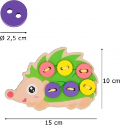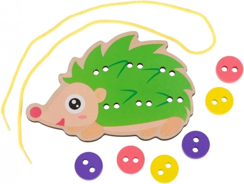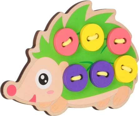 Tento prevliekací ježko je ideálna pomôcka pre prvé krôčiky v šnurovaní a „šití“. Deti prevliekajú šnúrku cez otvory a pripevňujú farebné gombíky na „ostne“ ježka. Veselé, sýte farby prirodzene lákajú k hre a učia rozlišovať farby aj tvary.