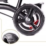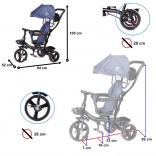 Pre maximálnu kontrolu je tu otočné sedadlo 360°, ktoré umožní jazdu čelom k rodičovi aj v smere. Voľné koleso (voľnobeh) dovolí rodičovi prevziať pohon jedným prepínačom. Bezdúšové kolesá zabezpečujú komfort ako nafukovacie, ale bez starostí s tlakom a rizikom defektu. Nechýba trojpolohová skladacia strieška so sieťkou, odnímateľná vodiaca tyč s penovým poťahom a praktické úložné doplnky.