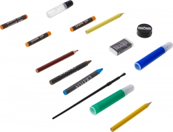 Súčasťou sú štetec, ceruzka, orezávač, guma a lepidlo. Každý prvok je starostlivo uložený a pripravený na použitie, čo uľahčuje vašu prácu.