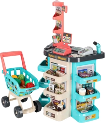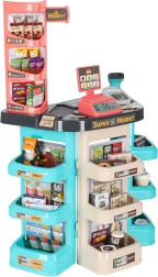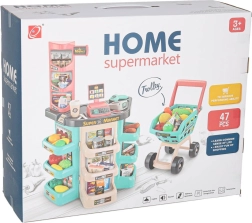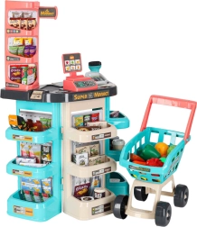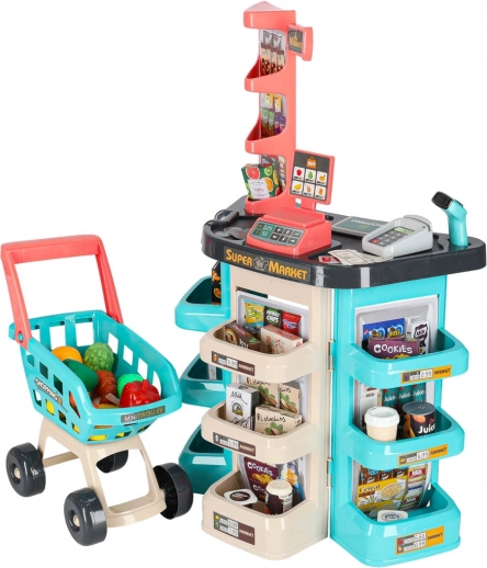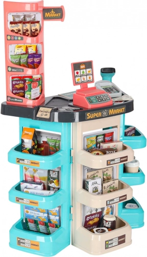 Veľký detský supermarket s vozíkom a bohatou sadou 47 dielov prenesie malých predavačov do sveta nakupovania. Nájdete v ňom platobný terminál a skener čiarových kódov so zvukmi, množstvo potravín a obalov, mince a bankovky aj váhu. Skvelá hračka na rozvoj kreativity, komunikácie a jemnej motoriky.