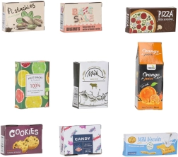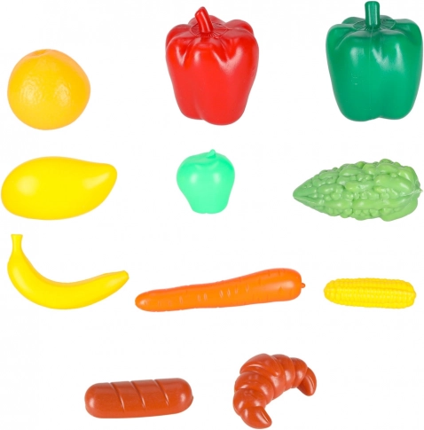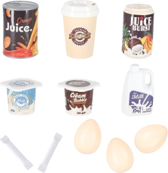 - Bohatá sada 47 dielov: jogurty, mlieko, džúsy, cukor, káva, sušienky, cukríky, pistácie, pečivo aj pestrá škála ovocia a zeleniny.