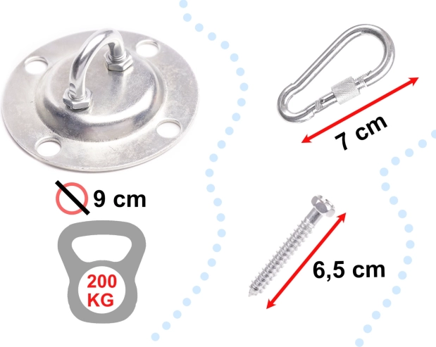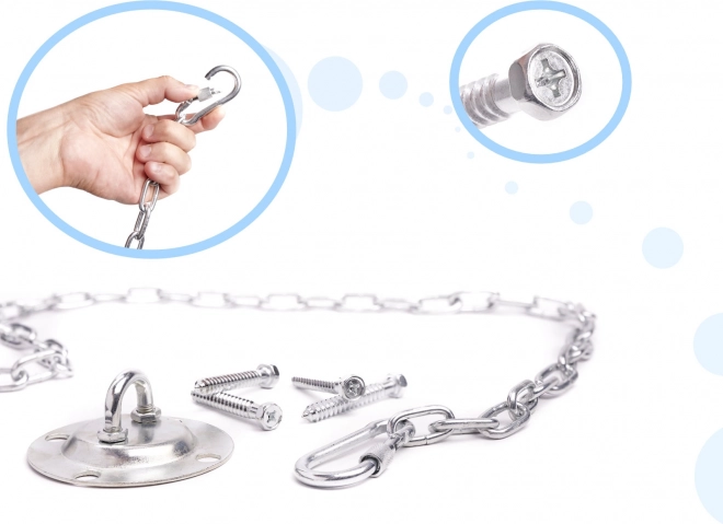 Kompletná sada s hákom, skrutkami, reťazou a karabínami uľahčí inštaláciu. Vhodné na montáž do dreva a betónu (pri použití zodpovedajúcich hmoždiniek).
