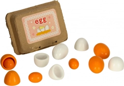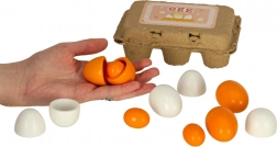 - 1× kartónové plato na 6 vajíčok, 6× drevené vajíčko (3 celé, 3 s vyberateľným žĺtkom)