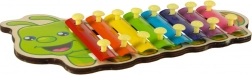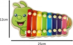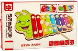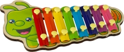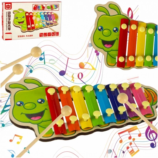 Veselý detský xylofón v tvare húsenice s ôsmimi kovovými plieškami na drevenom podstavci rozvíja sluch, rytmus a koordinačné zručnosti. Súčasťou sú 2 drevené paličky, s ktorými deti ľahko zahrajú prvé melódie a zároveň sa učia farby vďaka dúhovému zafarbeniu kláves.