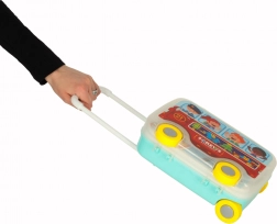 Kufrík slúži ako úložisko aj pracovná plocha s dierkovanou doskou. Vďaka kolieskam a výsuvnému madlu je ideálny na cesty.