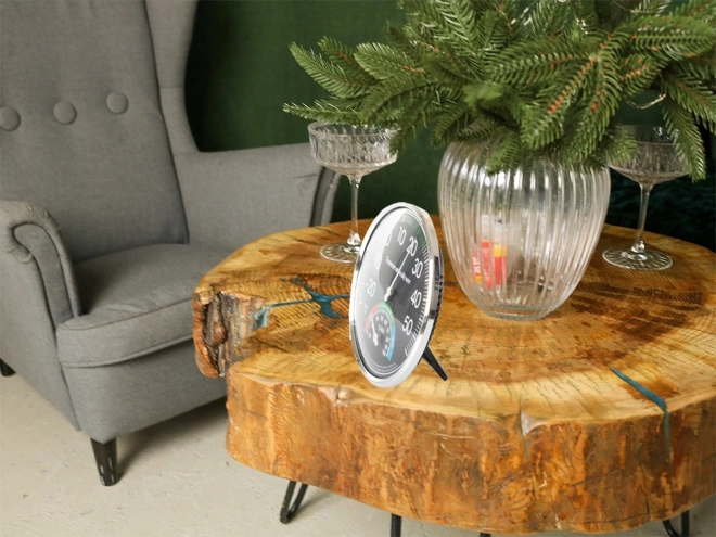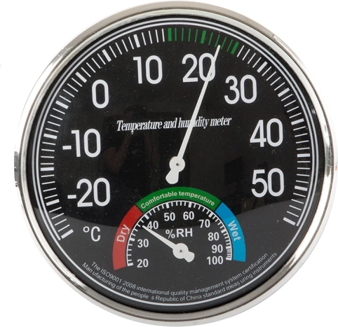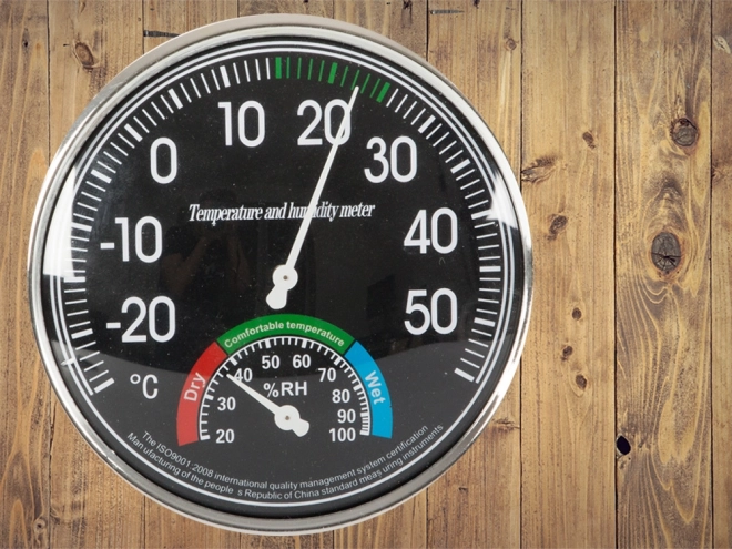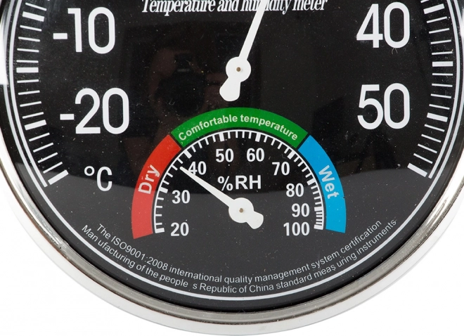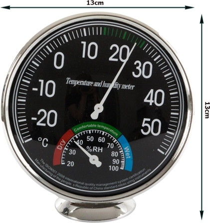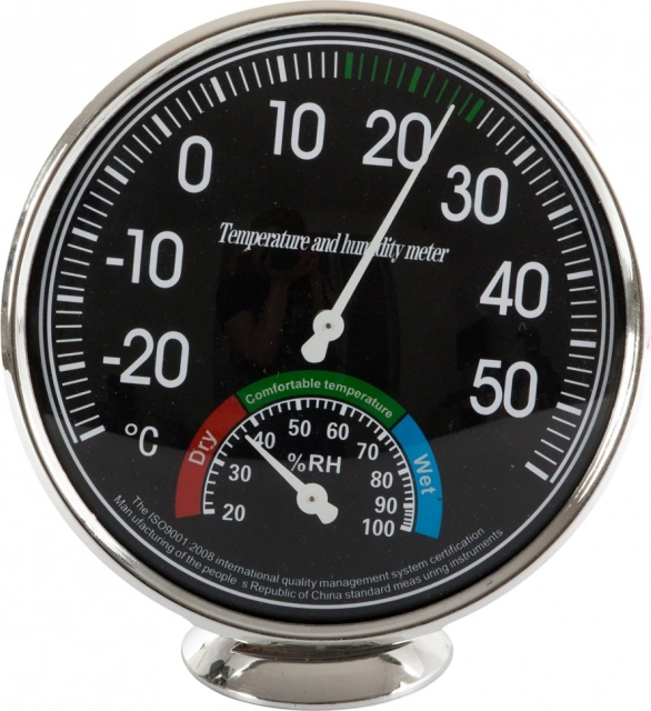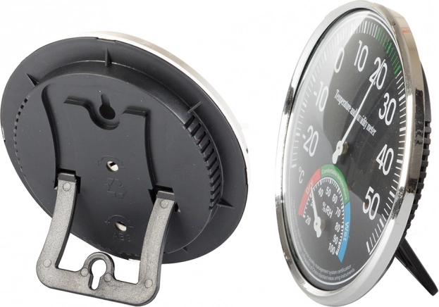 - Vybavený dvoma veľkými ciferníkmi - teplotný s priemerom 11 cm a vlhkostný 4 cm.