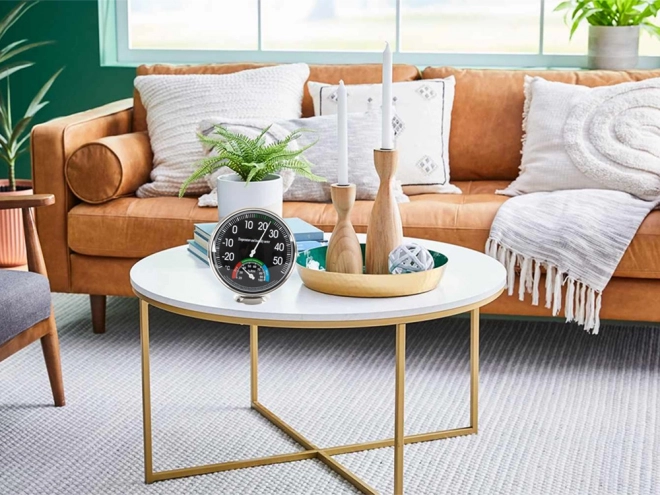 Analógový izbový teplomer a vlhkomer je ideálny pre použitie ako v interiéri, tak exteriéri. Ponúka prehľadné číselníky pre presné meranie teploty a vlhkosti, čo je dôležité pre prostredia ako sklady, knižnice alebo potravinárske prevádzky.