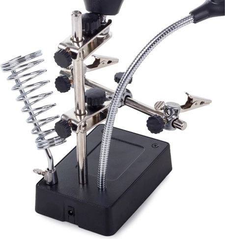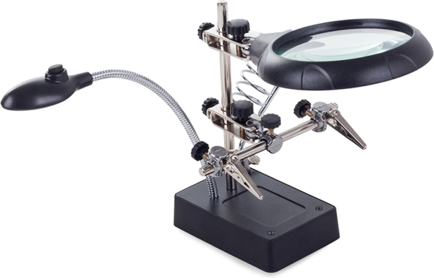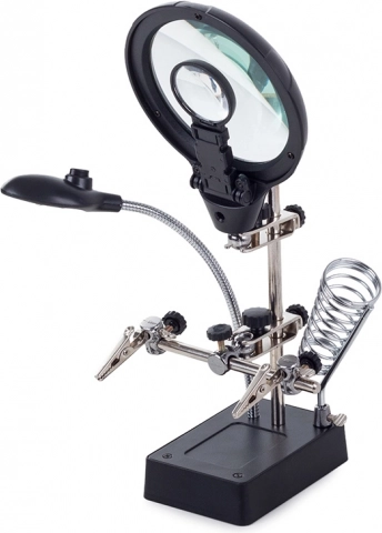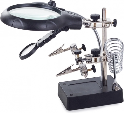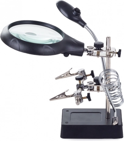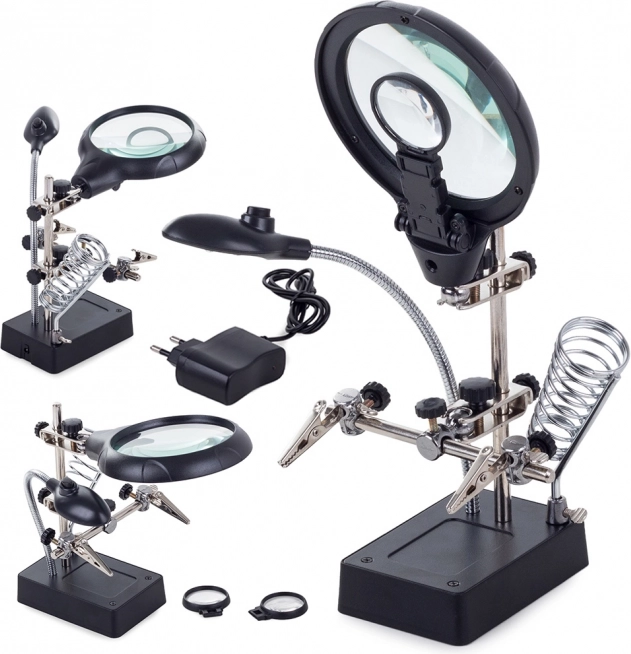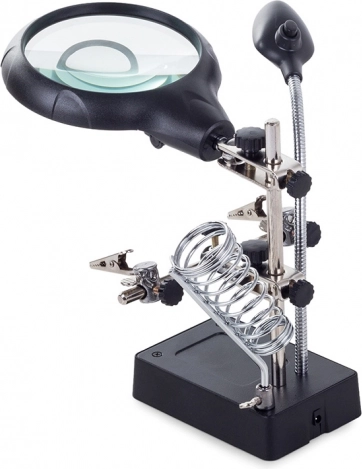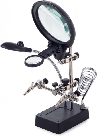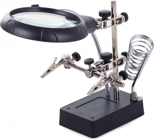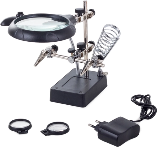 Tento montážny držiak „tretia ruka“ je nepostrádateľný pomocník pre elektronikárov, klenotníkov aj modelárov. Veľká lupa 2,5× (90 mm) doplnená dvoma prídavnými šošovkami 7,5× a 10× poskytuje čistý a jasný obraz. LED osvetlenie na flexibilnom husom krku nasvieti pracovnú plochu presne tam, kde je to potrebné.