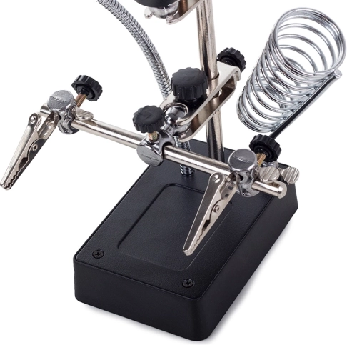 Silné krokosvorky a nastaviteľné ramená pevne držia obrobok. Špirálový držiak bezpečne odloží spájkovačku počas práce.
