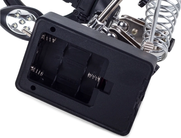 Robustné kovové ramená so silnými krokosvorkami a plne nastaviteľnými kĺbmi fixujú drobné súčiastky. Stabilná základňa s priestorom pre čistič hrotu a špirálový držiak spájkovačky zabezpečujú bezpečné a prehľadné pracovné prostredie. Napájanie je možné pomocou 3× AA (nie sú súčasťou) alebo priloženého napájacieho adaptéra 5 V / 1 A.